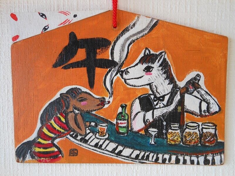 干支をお酒をテーマに絵馬にしました。 板にアクリル画 サイズ 縦15.5㎝ 横21.5㎝ 厚5㎜
